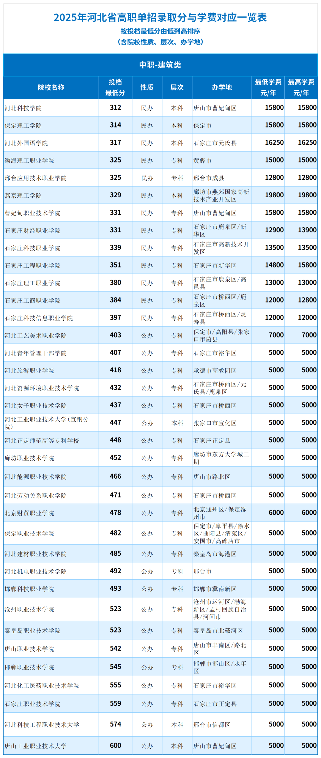25年河北单招【中职-建筑类】各院校学费-录取分一览表(含院校性质、层次、办学地)
