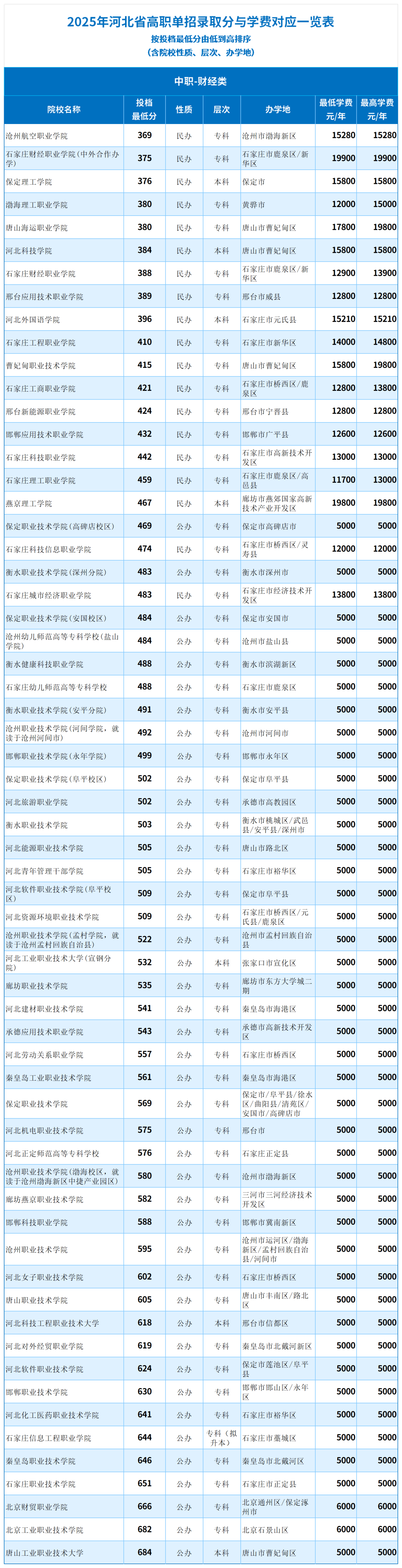25年河北单招【中职-财经类】各院校学费-录取分一览表(含院校性质、层次、办学地)