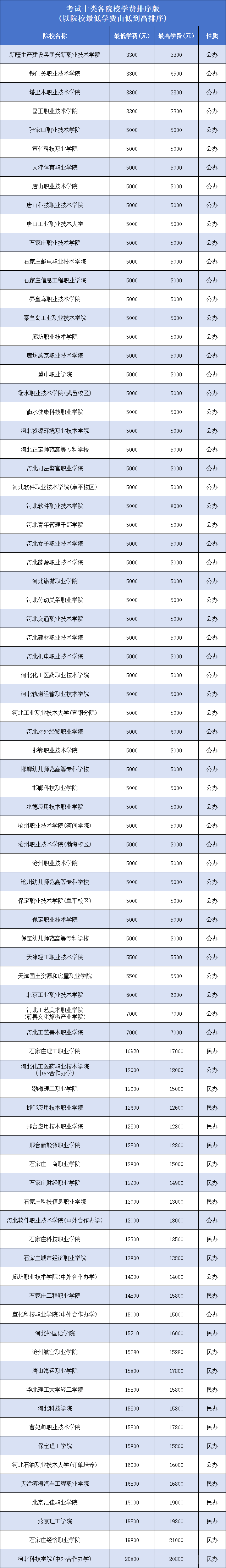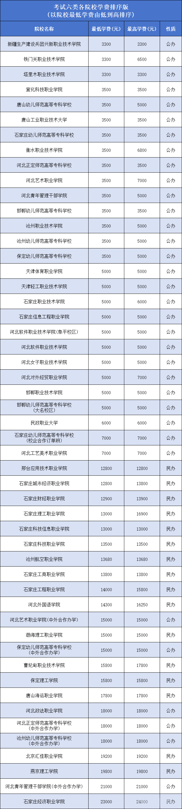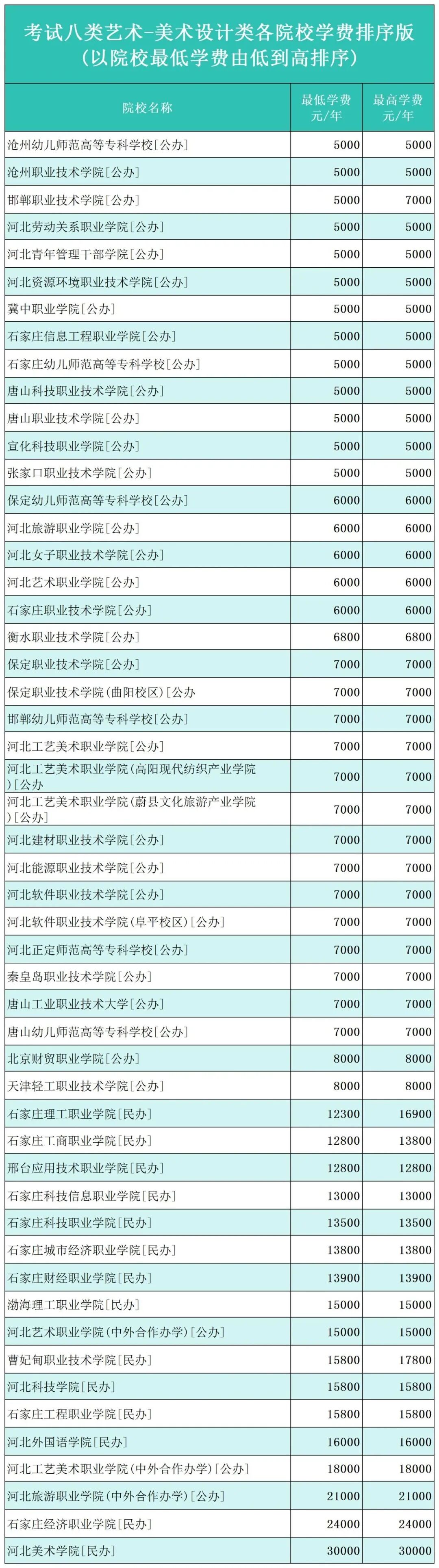 最高学费:石家庄医学高等专科学校(中外合作)27000元、河北美术学院30000元; 以上数据根据2025年河北省高职单招招生计划整理,仅供参考。2026年学费问题请关注相关单招院校官网。