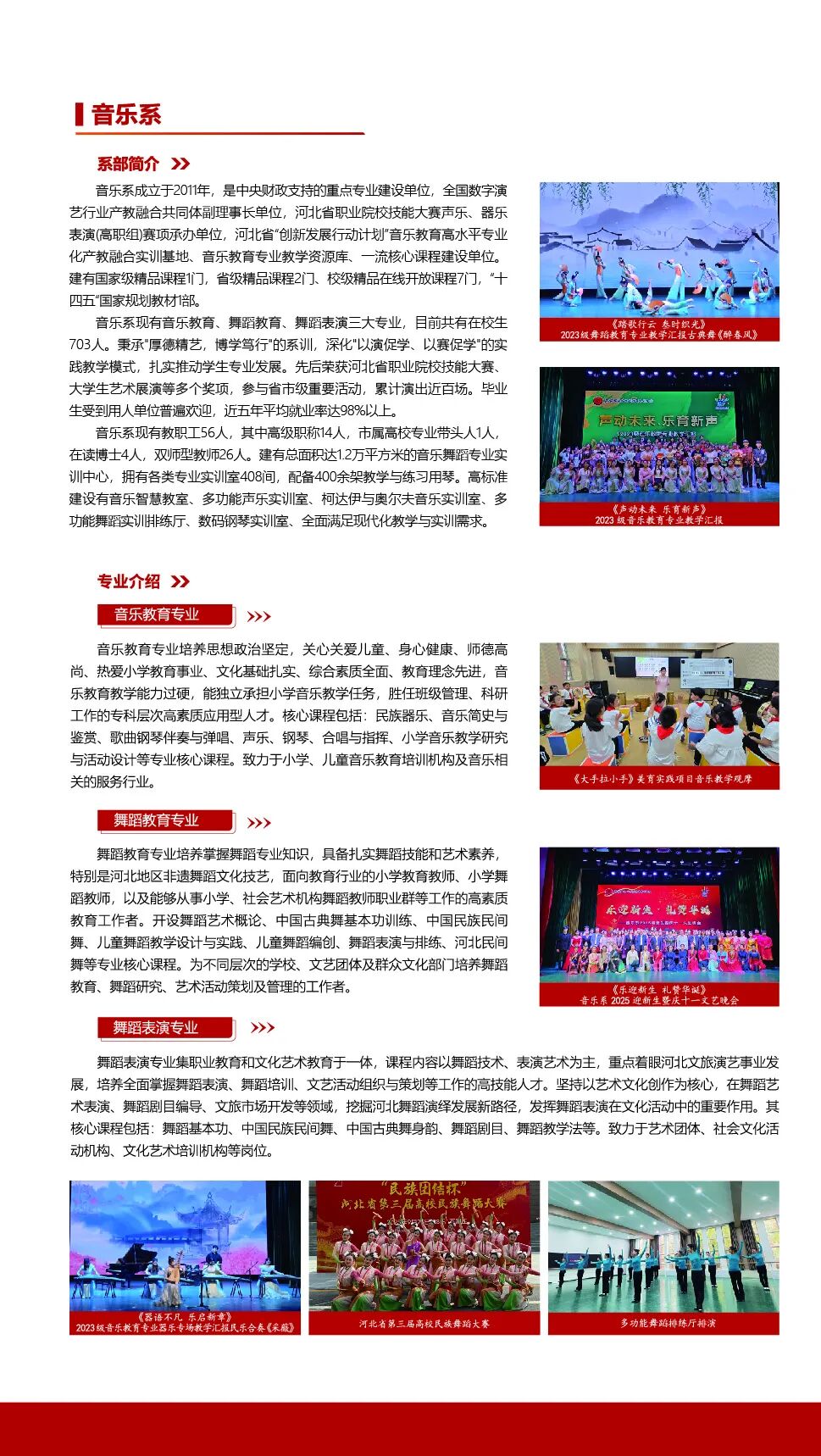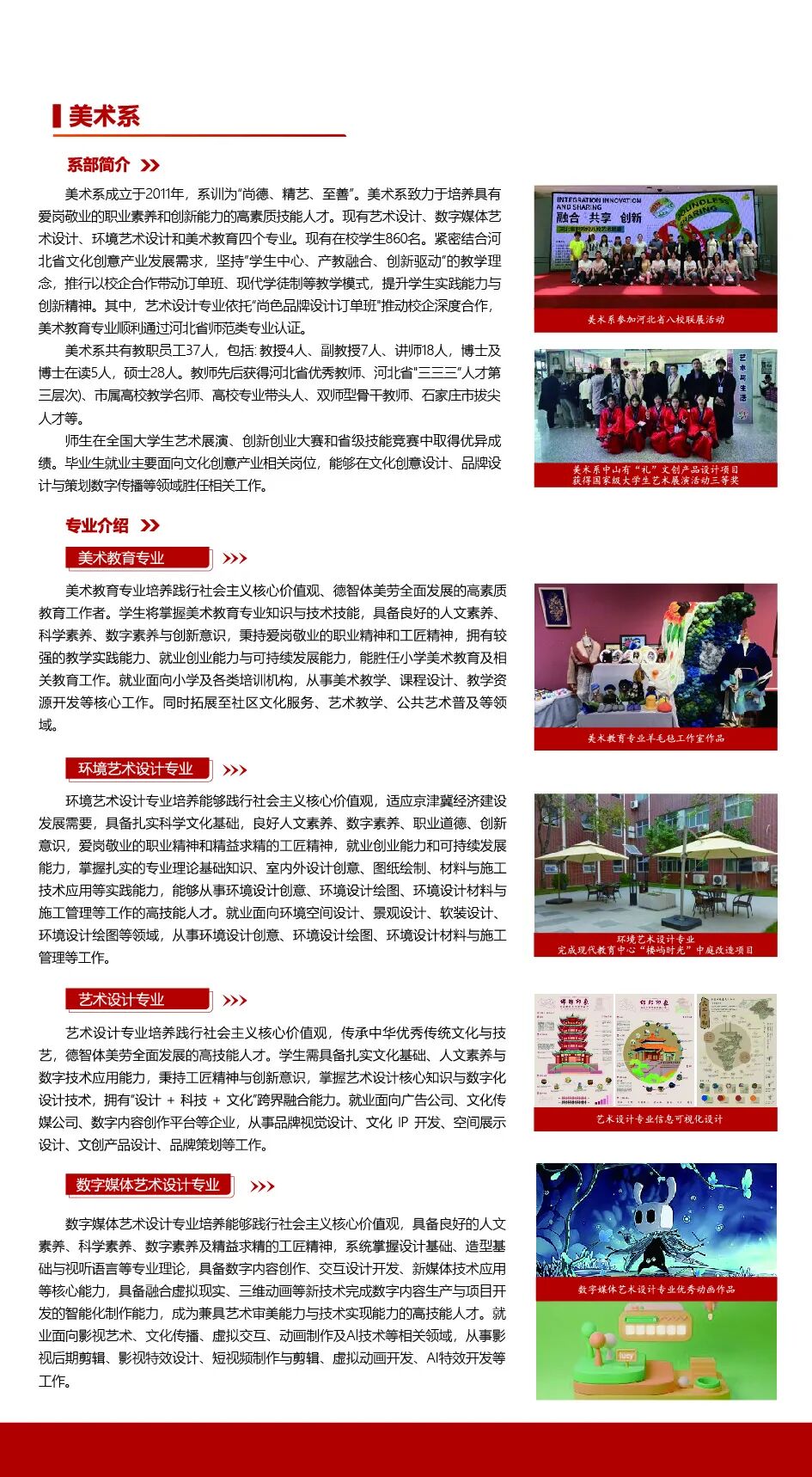 学院设有机电工程学院、信息工程与艺术设计学院、财经旅游学院、土木工程系、汽车工程系、电子商务系等六个教学院系和马克思主义学院、基础部。学院现有在校学生近1.2万人,在办39个专业,其中有2个省级示范专业,高等职业教育创新发展行动计划河北省骨干专业2个,32个“1+X”证书制度试点。建有2个国家级实训基地、1个省级实训基地和2个获批中央财政支持的高等职业学校提升专业服务发展能力项目专业。拥有9个校内实训中心,74个校内实践基地,拥有领克汽车等75个校外实训基地。拥有国家级职业技能鉴定所、中国汽车人才培养工程授权教学基地、专项技能认证培训和考核基地。是河北省高校毕业生就业(创业)服务基地。