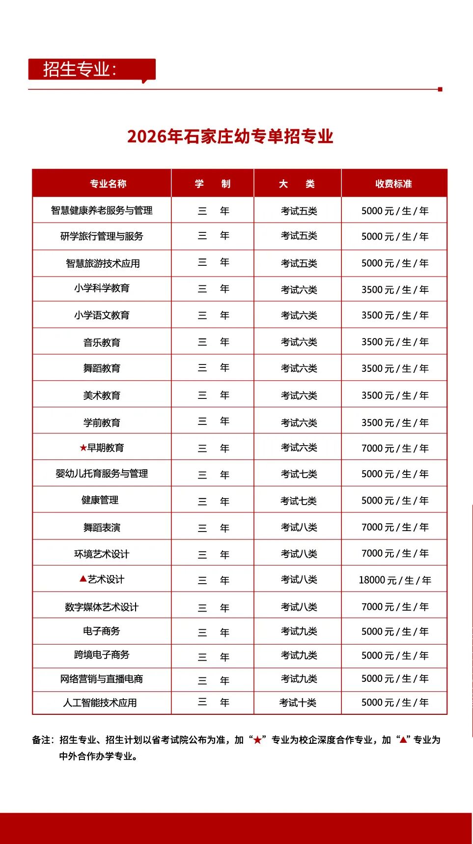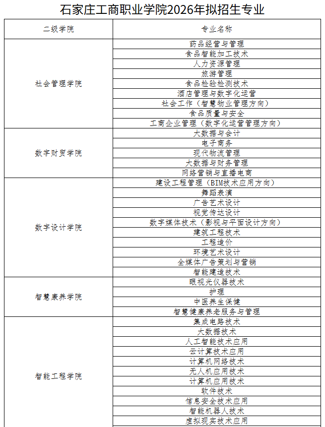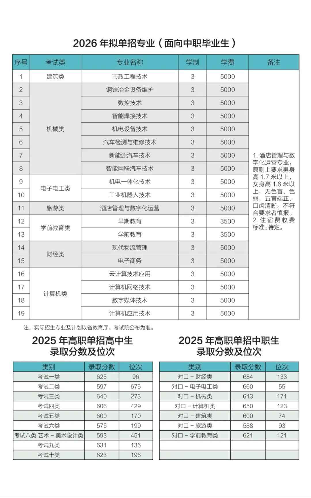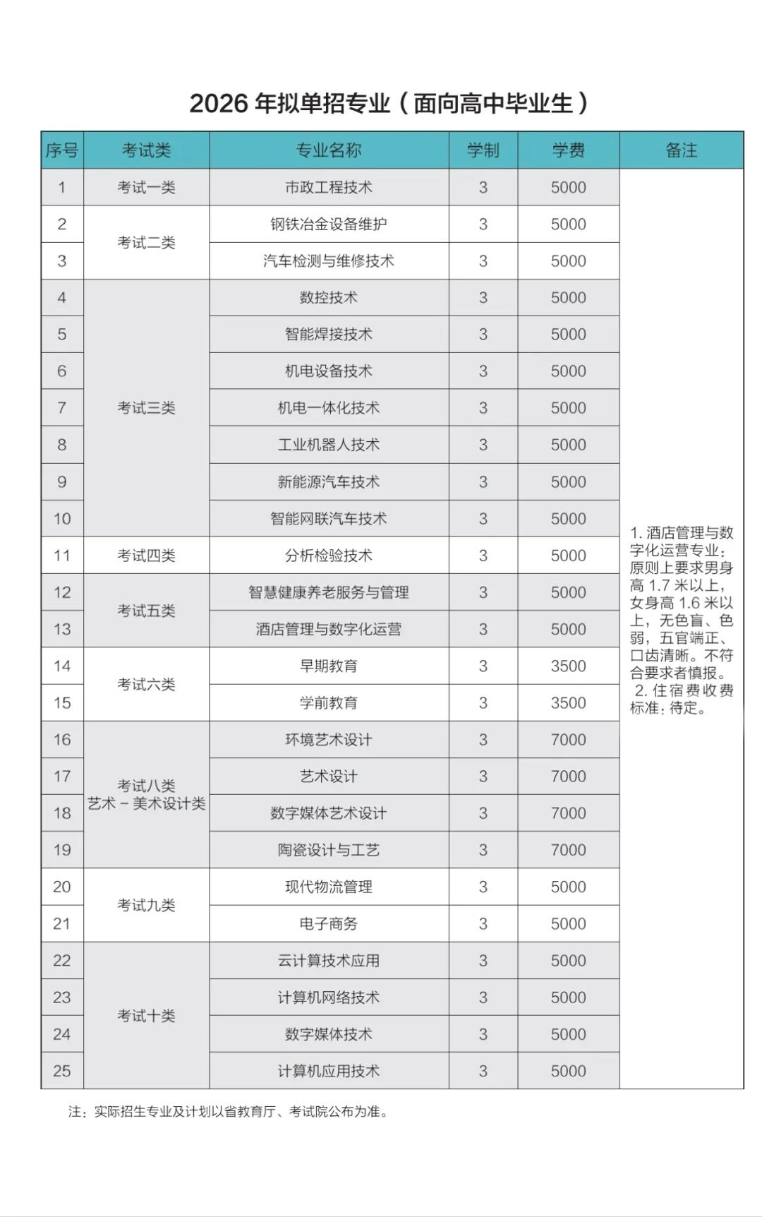 2026年各招生专业计划按面向普通高中毕业生计划和面向中职生计划分列。具体招生计划详见我院官网和河北省教育考试院公布的2026年河北省普通高职院校单独考试招生计划。2026年我院单招总计划为:6790人。
