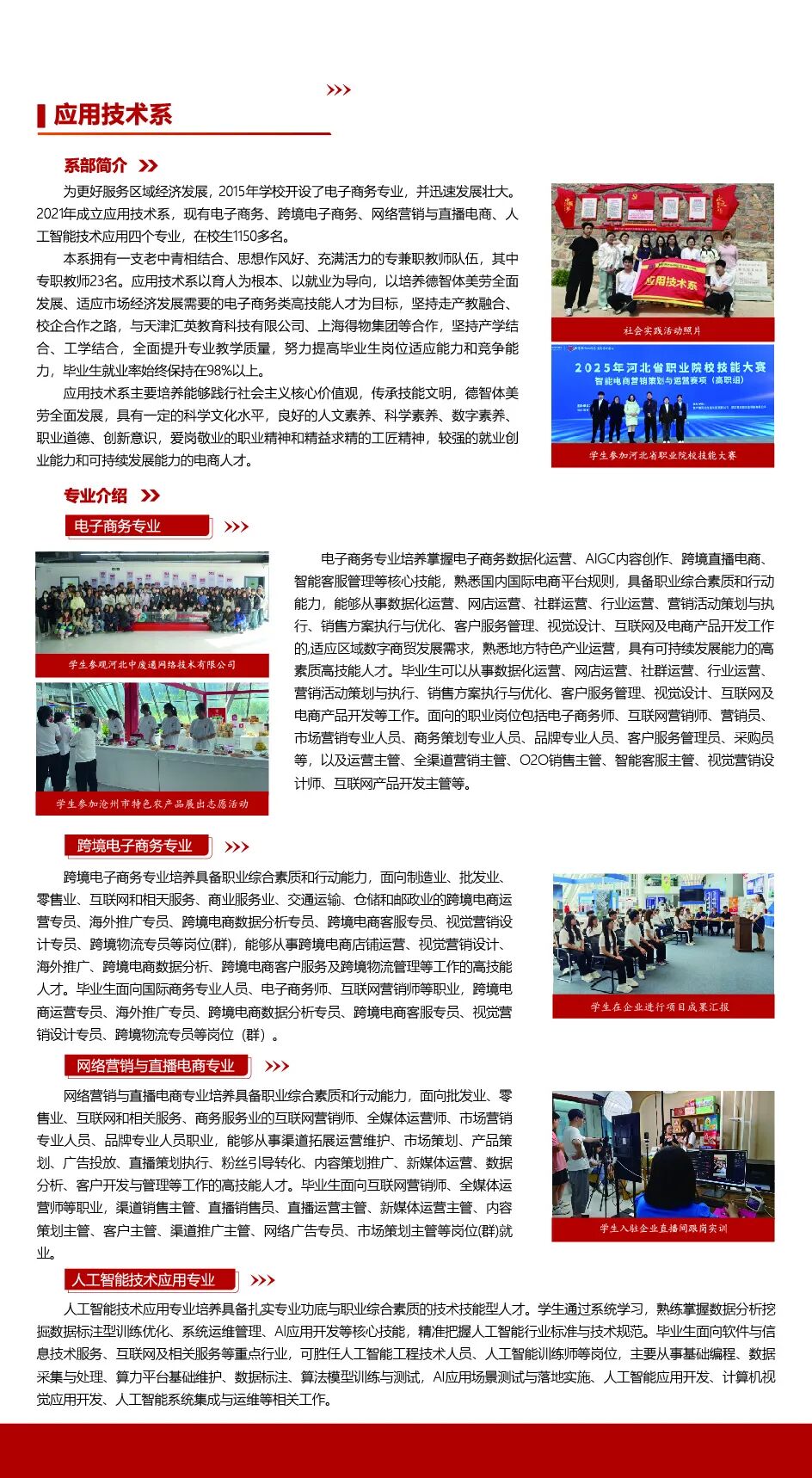 学院立足京津冀协同发展大局,锚定河北省八大支柱产业与石家庄市主导产业,系统构建专业体系。以“产教融合、数智赋能、集群发展”为核心理念,打造“智能技术与数字创新、智能制造与先进交通、智慧建筑与艺术设计、数字贸易与现代物流、健康科技与生活服务”五大专业集群,涵盖人工智能技术应用、大数据技术、机电一体化技术、新能源汽车技术、数字媒体技术、大数据与会计、食品检验检测技术、护理等50个专业。全面对接新一代信息技术、高端装备制造、数字文旅、现代商贸物流、大健康等重点领域。