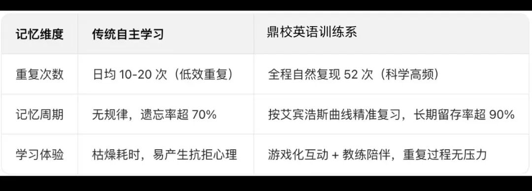 ✅ 鼎校解决方案:用智能算法压缩记忆周期,3 年词汇量浓缩至 20 小时攻克,依托「艾宾浩斯记忆曲线 + 真人教练追踪」,实现长期记忆留存率超 90%!