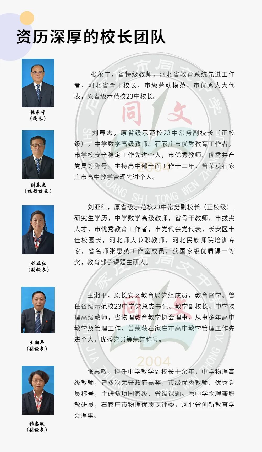 同文中学领导班子是一个向心力强、团结奋斗、配合默契的领导团队。校长张永宁是原23中校长,曾获河北省特级教师、河北省教育系统先进工作者、河北省骨干校长、石家庄市劳动模范、石家庄市优秀党员、石家庄市优秀人大代表等荣誉称号。他热爱教育事业,心怀教育理想,具有开阔的视野和宽厚的人文情怀。如今的同文中学由张永宁校长亲自挂帅,集结了历经近20年淬炼磨合的23中原班子团队。他们曾将23中高中跃升为省级示范校,共同缔造中高考辉煌成绩,被长安区教育局誉为“打粮食主力军”。他们相互信赖、共经风雨,同舟共济,形成了强大的领导力、执行力,他们文化认同、理念一致、优势互补,形成了系统完整、风格独特的办学理念和办学体制。这支精锐团队再次汇聚在一起,致力创办“学生喜欢、家长满意、百姓期待、社会瞩目的优质品牌高中”,让每一名学生享有公平而有质量、理性而有温度的教育,全面而有个性的发展,实现最大增值。相信在这支团队的引领下,同文中学定会锚定新目标、领跑新赛道,推动学校发展迈向更高水平!